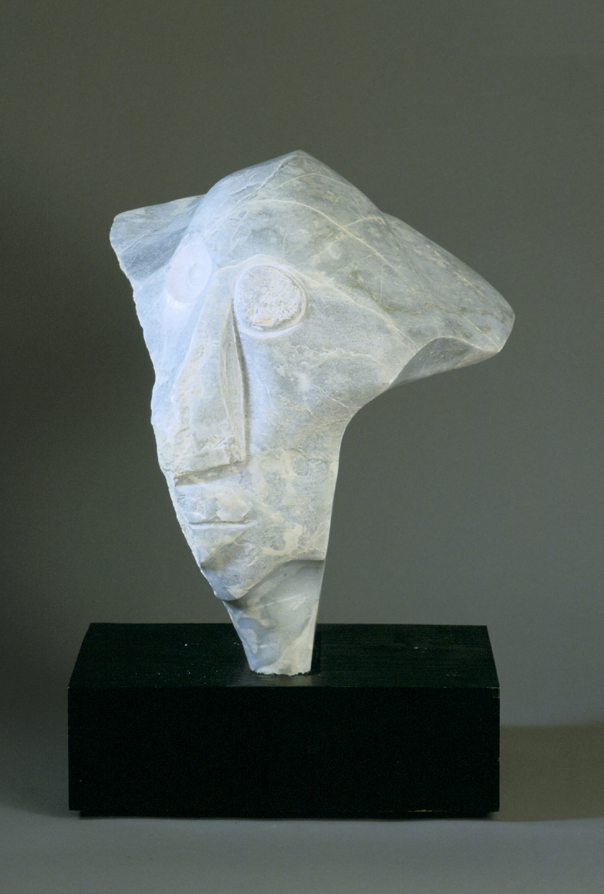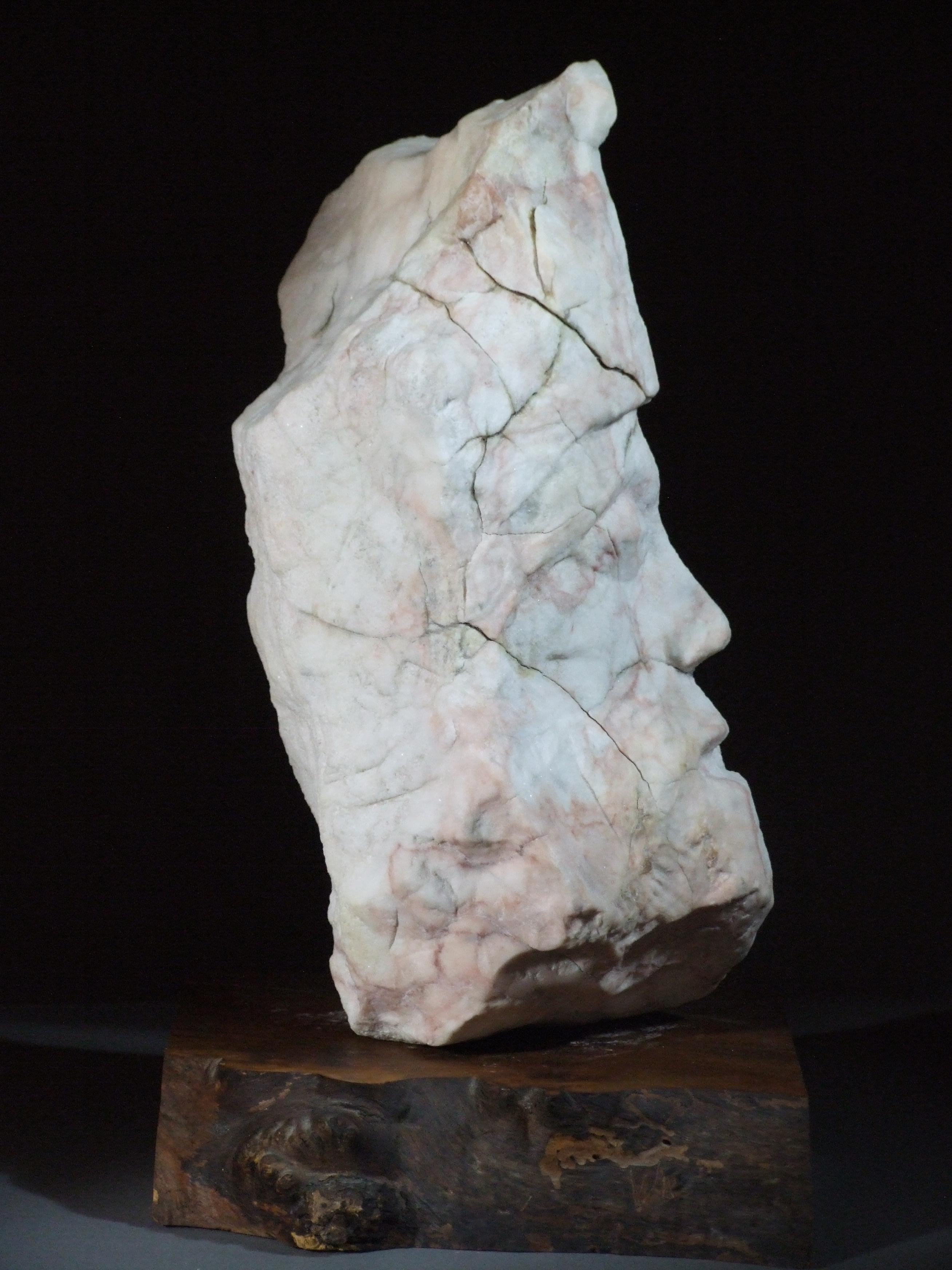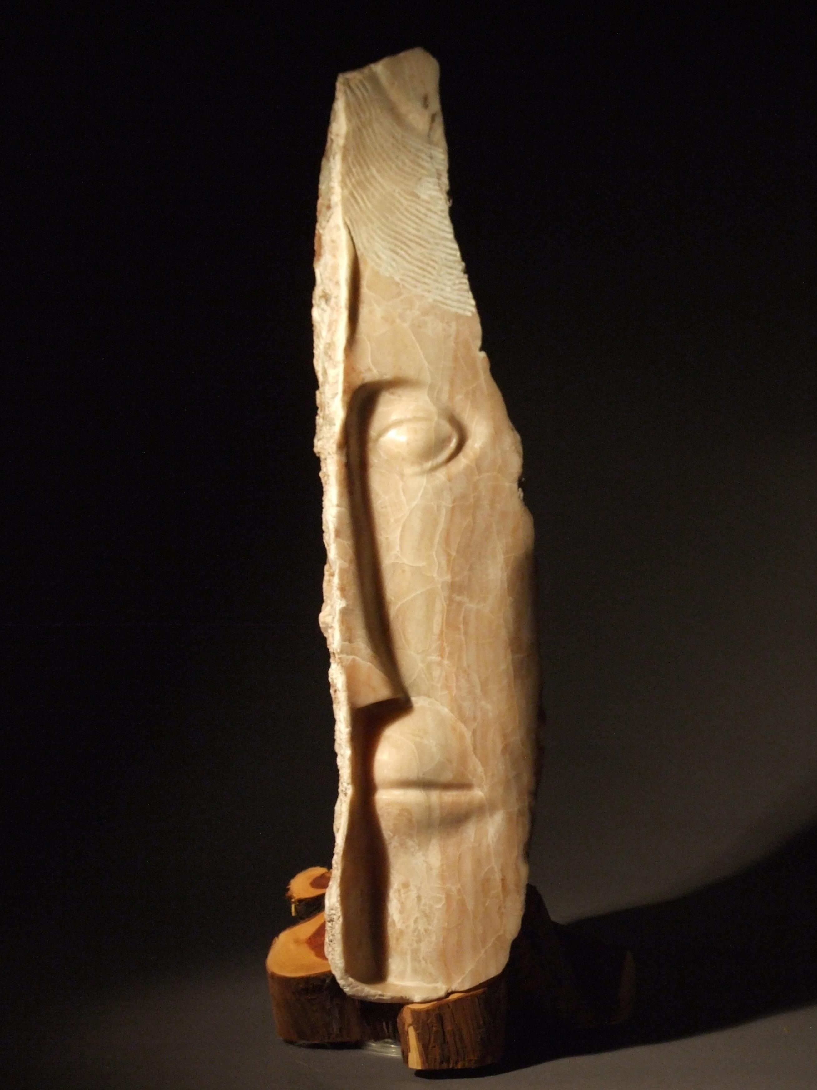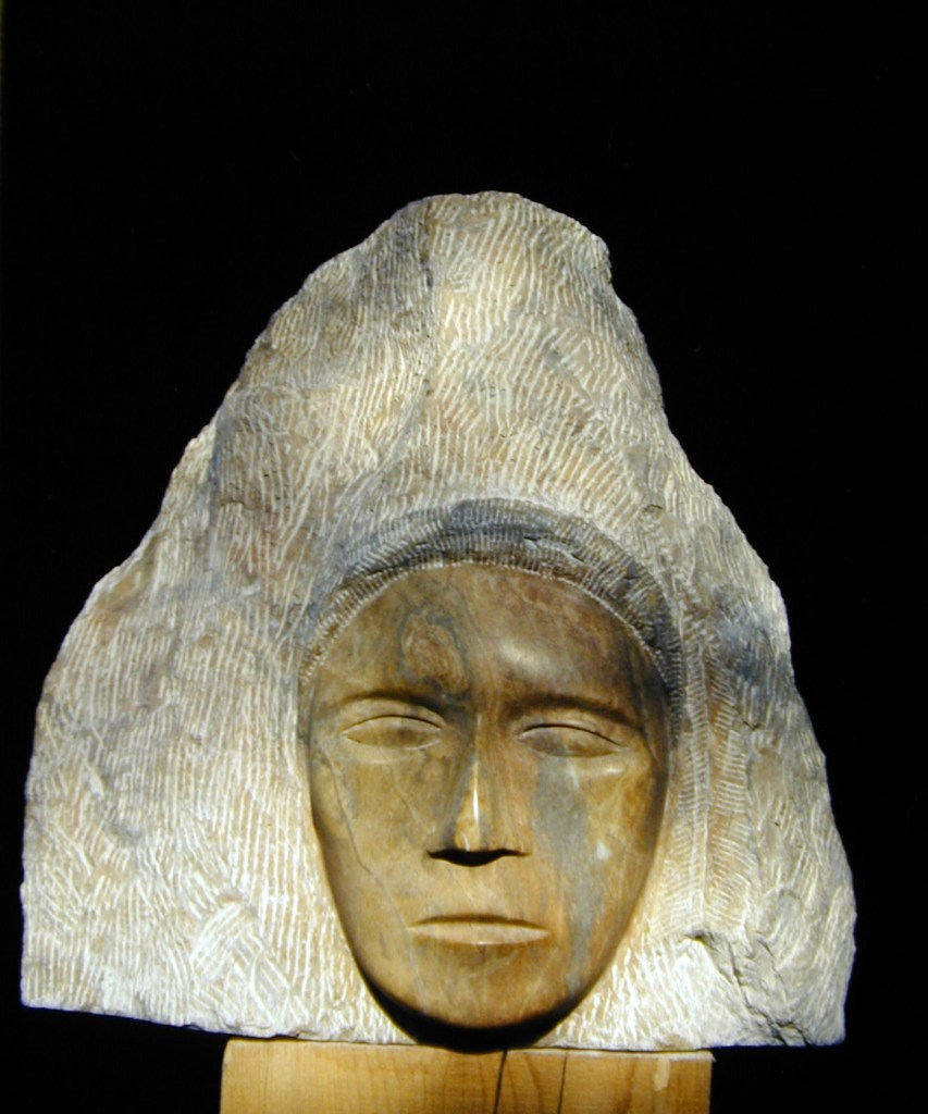 “Curandera” is a Spanish word, meaning healer. It was inspired in part by Black Mesa, New Mexico, a large, round sheer-sided mesa. There, long ago, Pueblo people successfully resisted conquistadors. The stone and Black Mesa share a similar profile. Long after Curandera was completed, I was informed of a similarity between it and the face of Geronimo, the legendary Chiricahua warrior and medicine man.