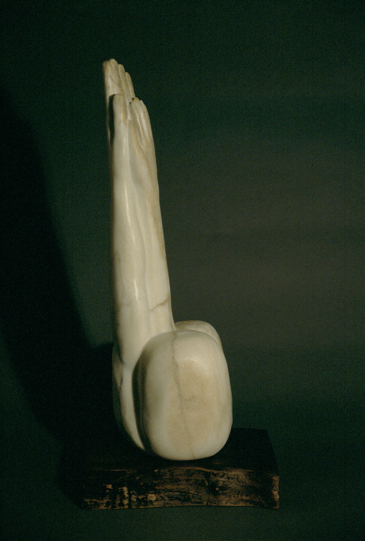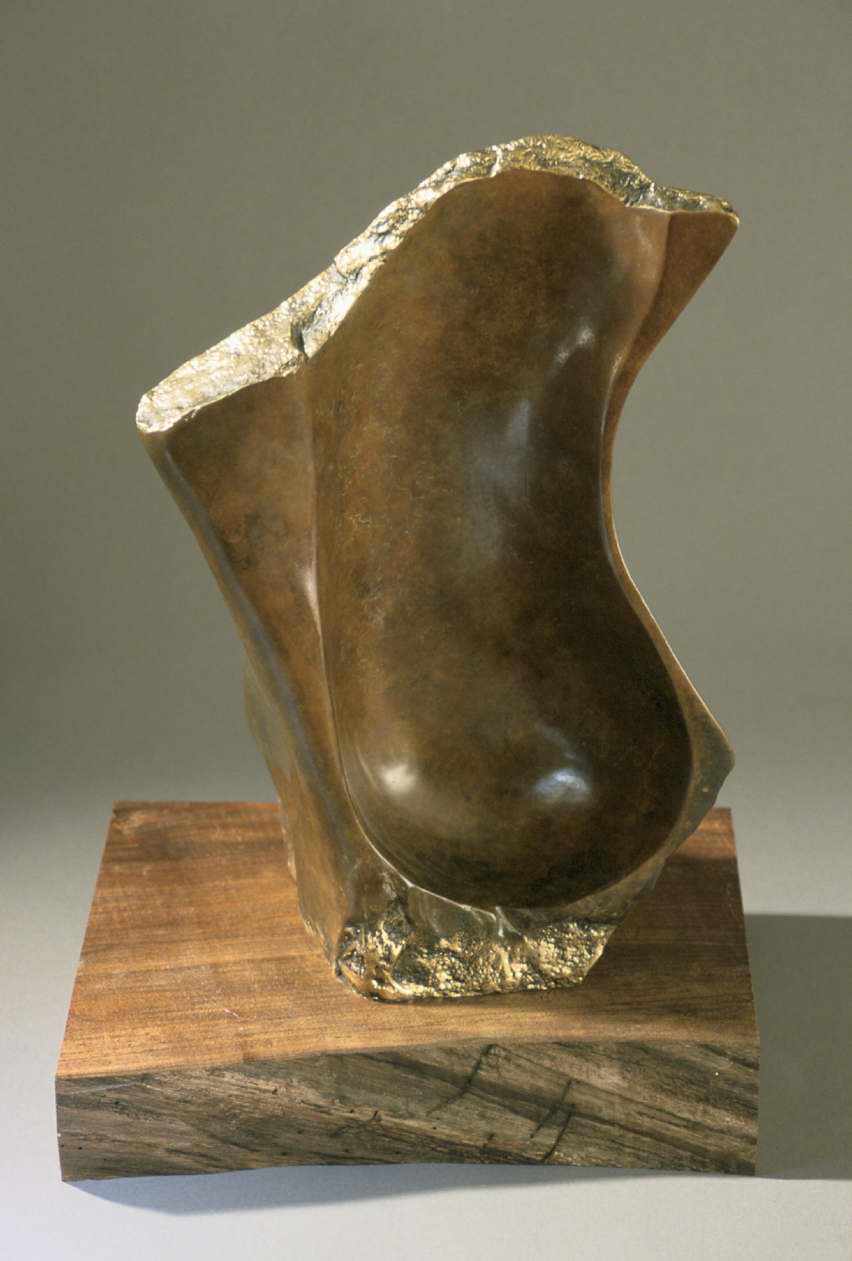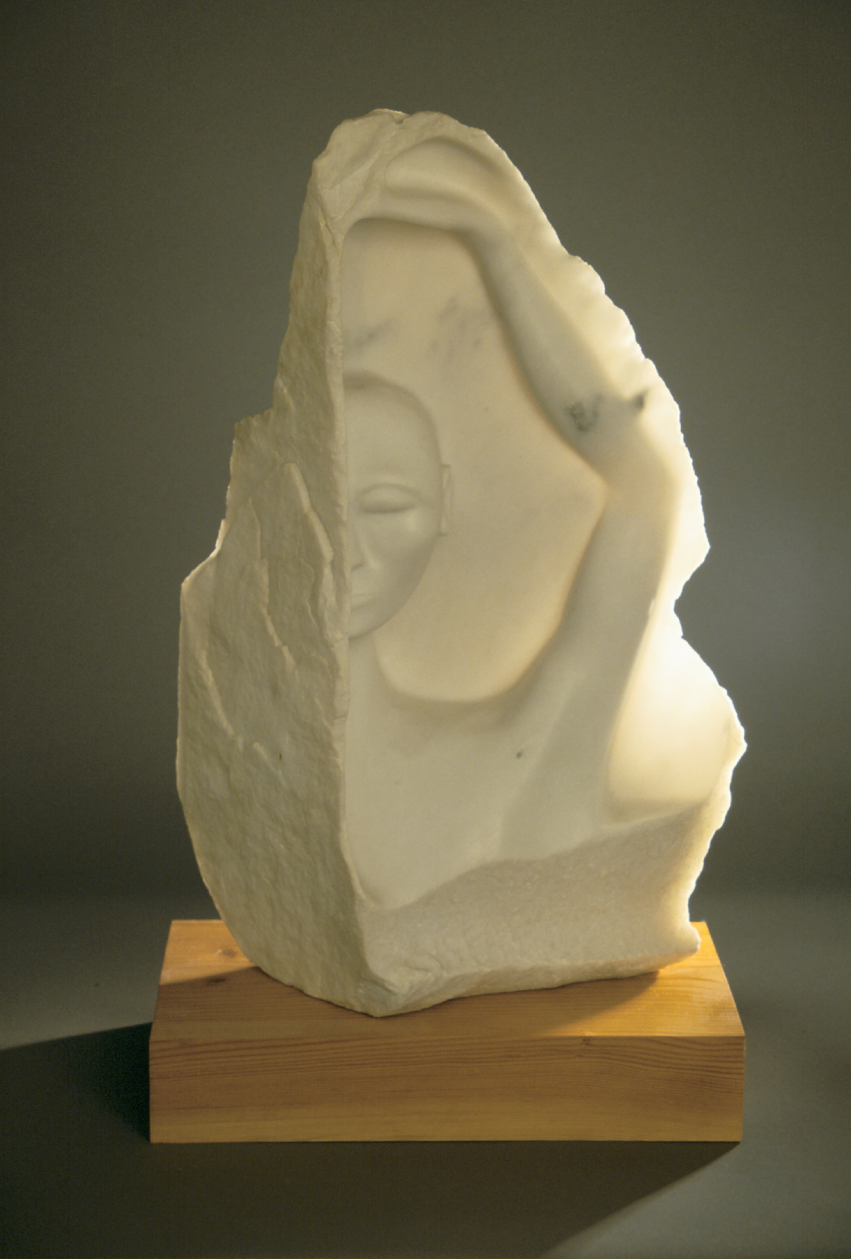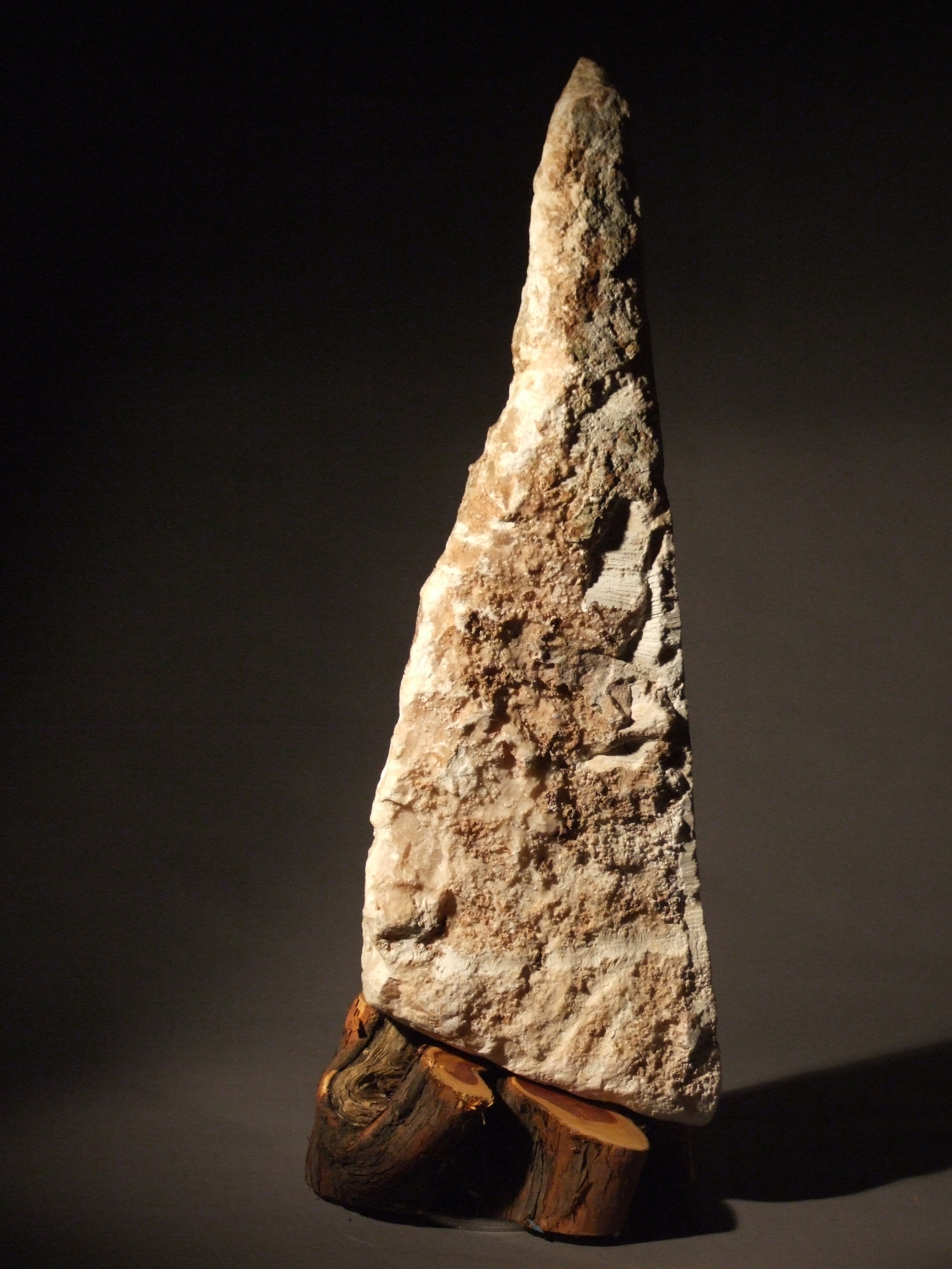 “Curandera” is a Spanish word, meaning healer. It was inspired in part by Black Mesa, New Mexico, a large, round sheer-sided mesa. There, long ago, Pueblo people successfully resisted conquistadors. The stone and Black Mesa share a similar profile. Long after Curandera was completed, I was informed of a similarity between it and the face of Geronimo, the legendary Chiricahua warrior and medicine man.